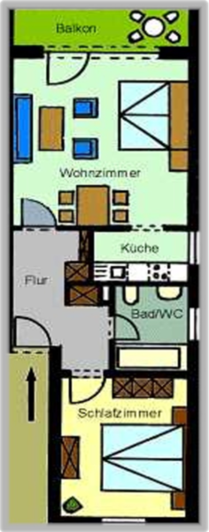 Dem Wohn-/Schlafzimmer ist ein großer Balkon vorgelagert. Auser der Diele haben alle Räume Fenster.