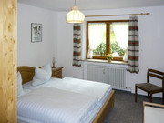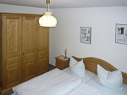 Das Schlafzimmer besteht aus einem Doppelbett mit zwei Nachtschränkchen und einem dreitürigen Schrank aus hellem Massivholz.