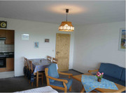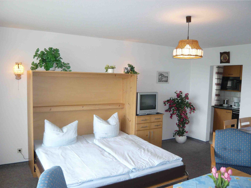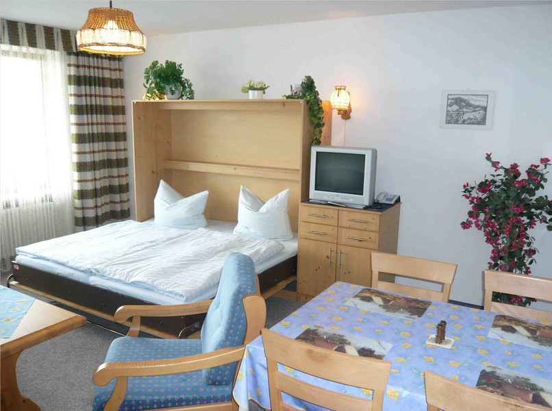 einem Schrankbett (vollwertiges Doppelbett), Essgruppe für vier Personen, alles aus hellem Massievholz, ausgestattet.