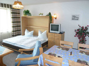 Das Wohn-/Schlafzimmer ist mit einer Coachgarnitur (Sofa und zwei Sessel),